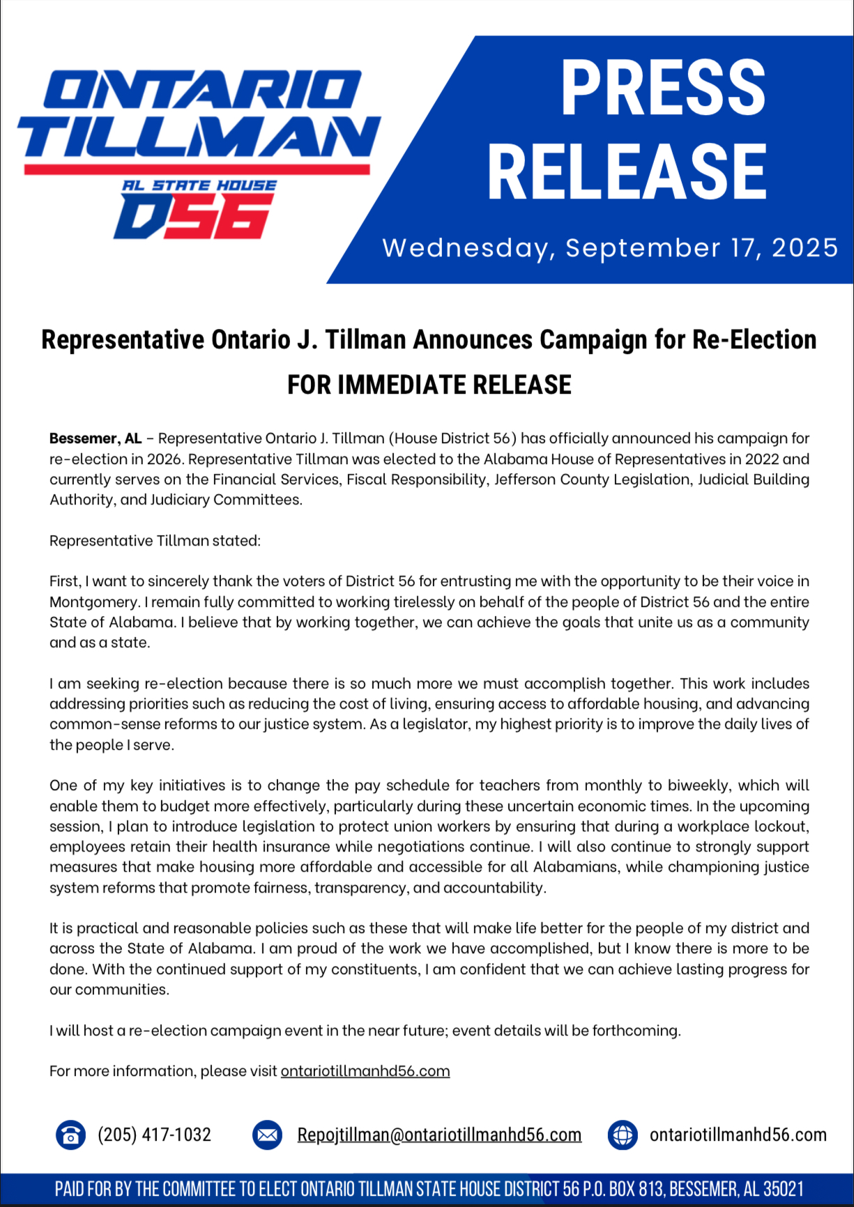 Re-elect Ontario Tillman
